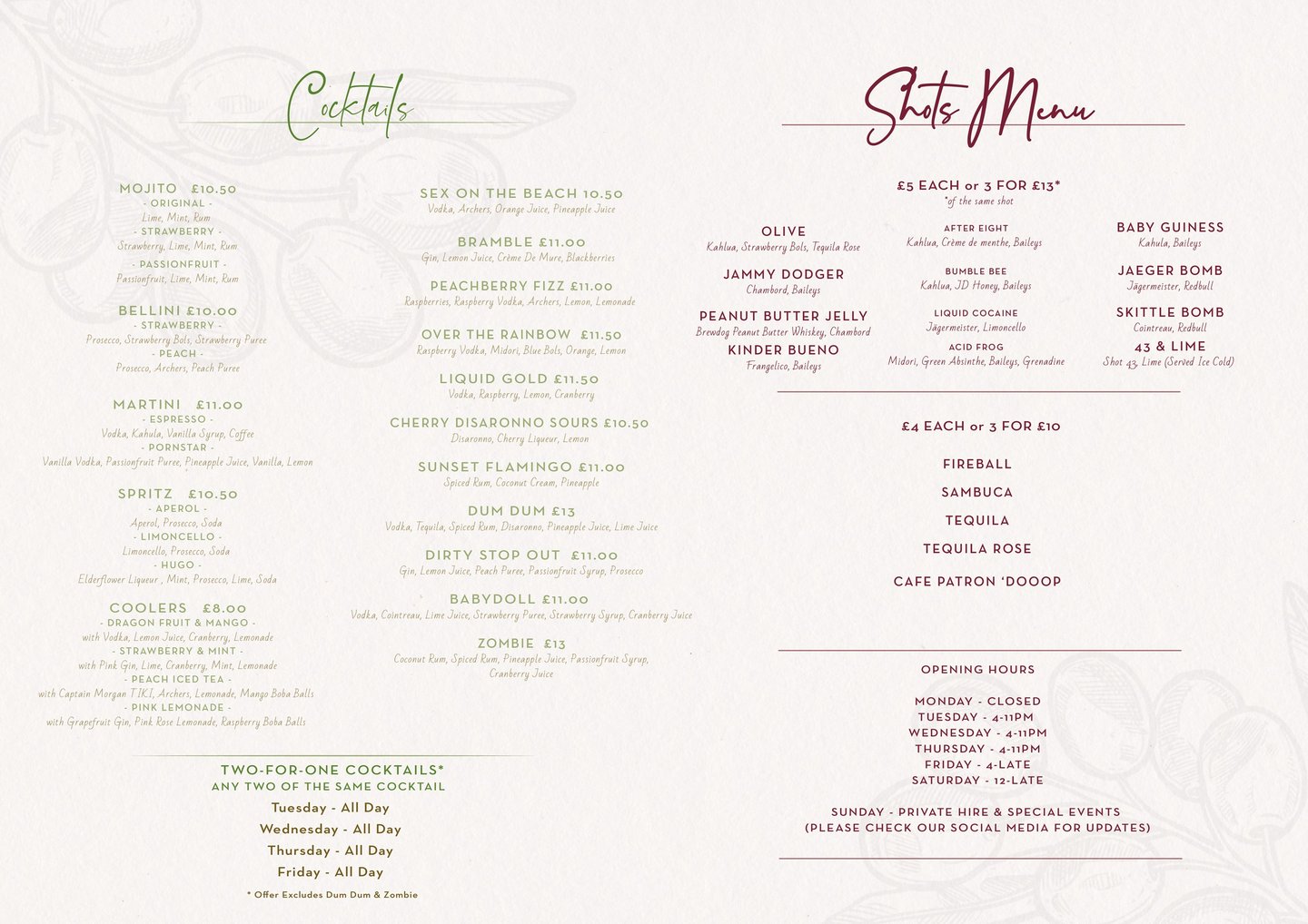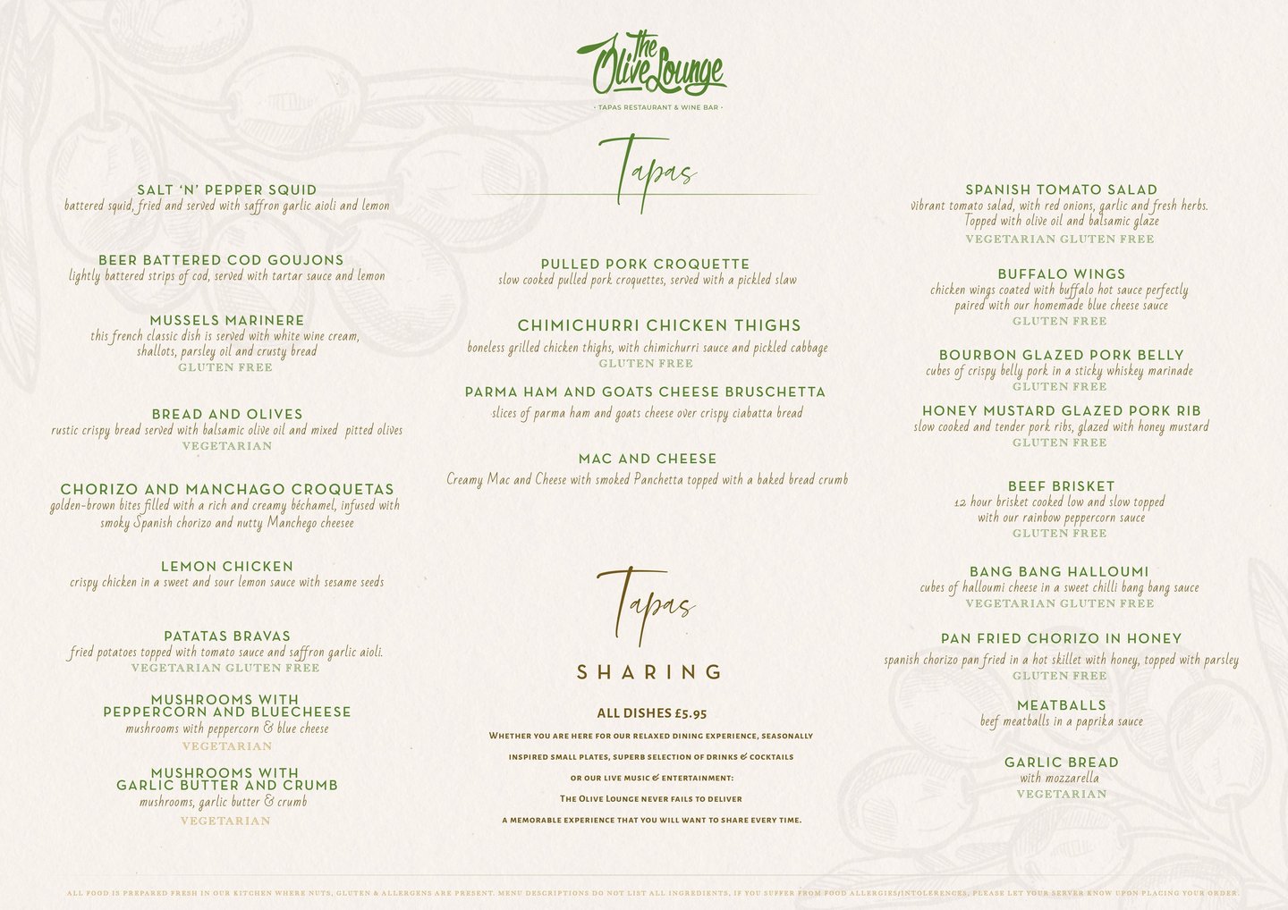 At The Olive Lounge we freshly prepare all of our food, so that you can experience the true taste of authentic tapas. We also have an extensive drinks menu that includes our delicious twisted cocktails.